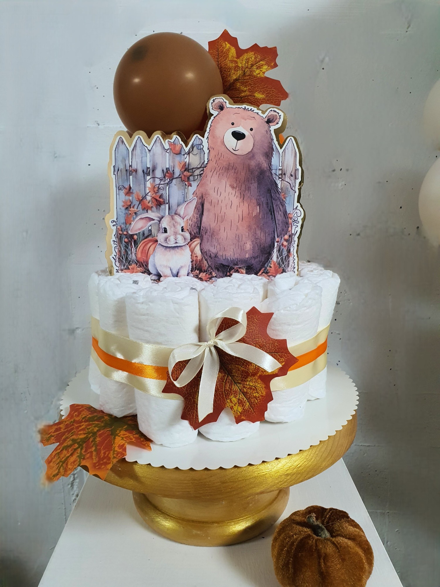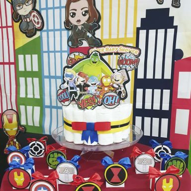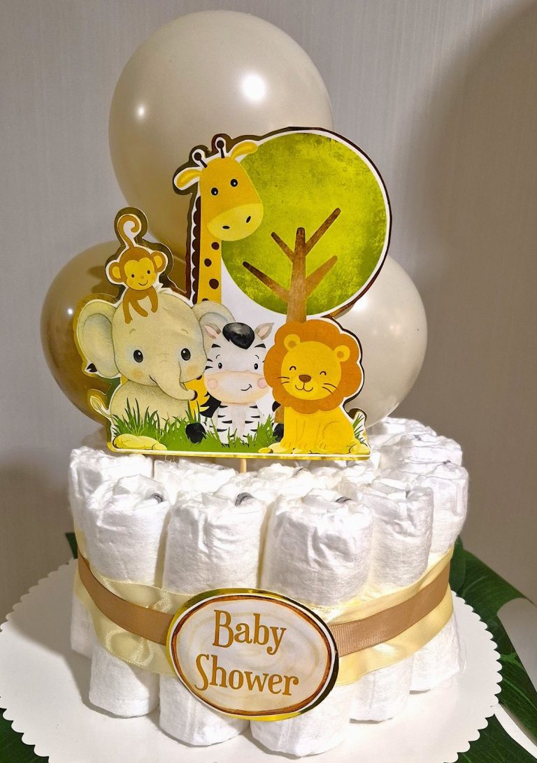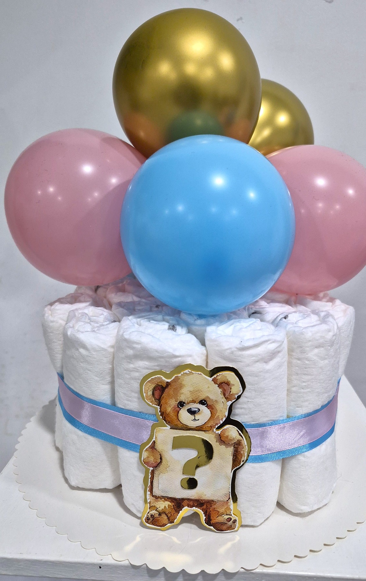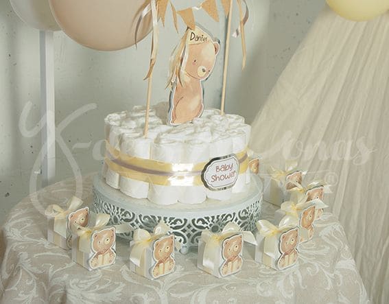 Tarta de pañales para baby shower en Madrid. Regalo práctico y decorativo, ideal para combinar con decoración con globos. Servicio disponible en Madrid y alrededores.